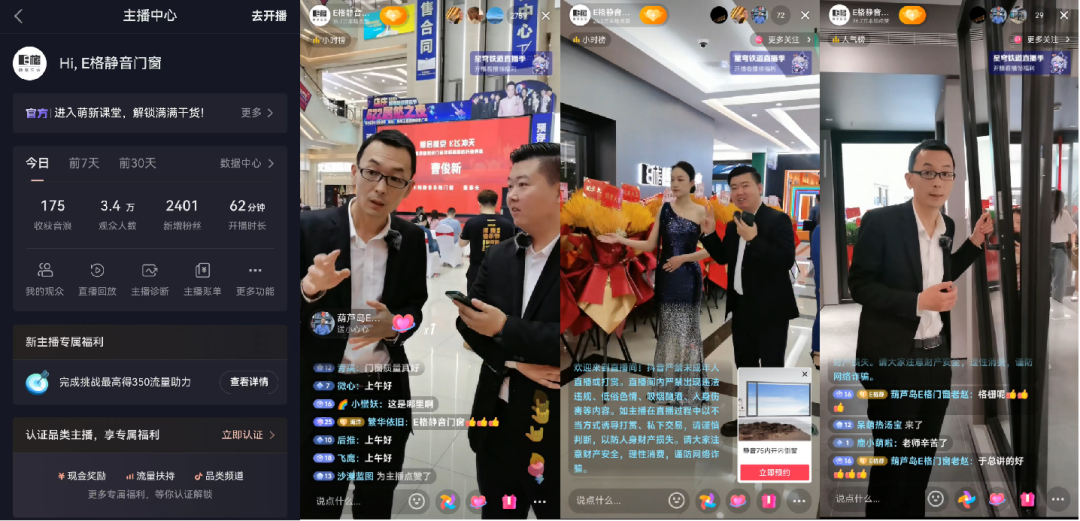 作為走在時代前沿的系統(tǒng)門窗品牌,E格靜音系統(tǒng)門窗構建自有新媒體矩陣,展開營銷新模式。此次開業(yè)典禮同步開啟抖音直播,全程記錄,線上觀眾反響十分熱烈,直播間觀看人數高達3.4萬,全面助力企業(yè)終端客單量增長,成功轉化數十客資,完美拓開直播營銷新局面!